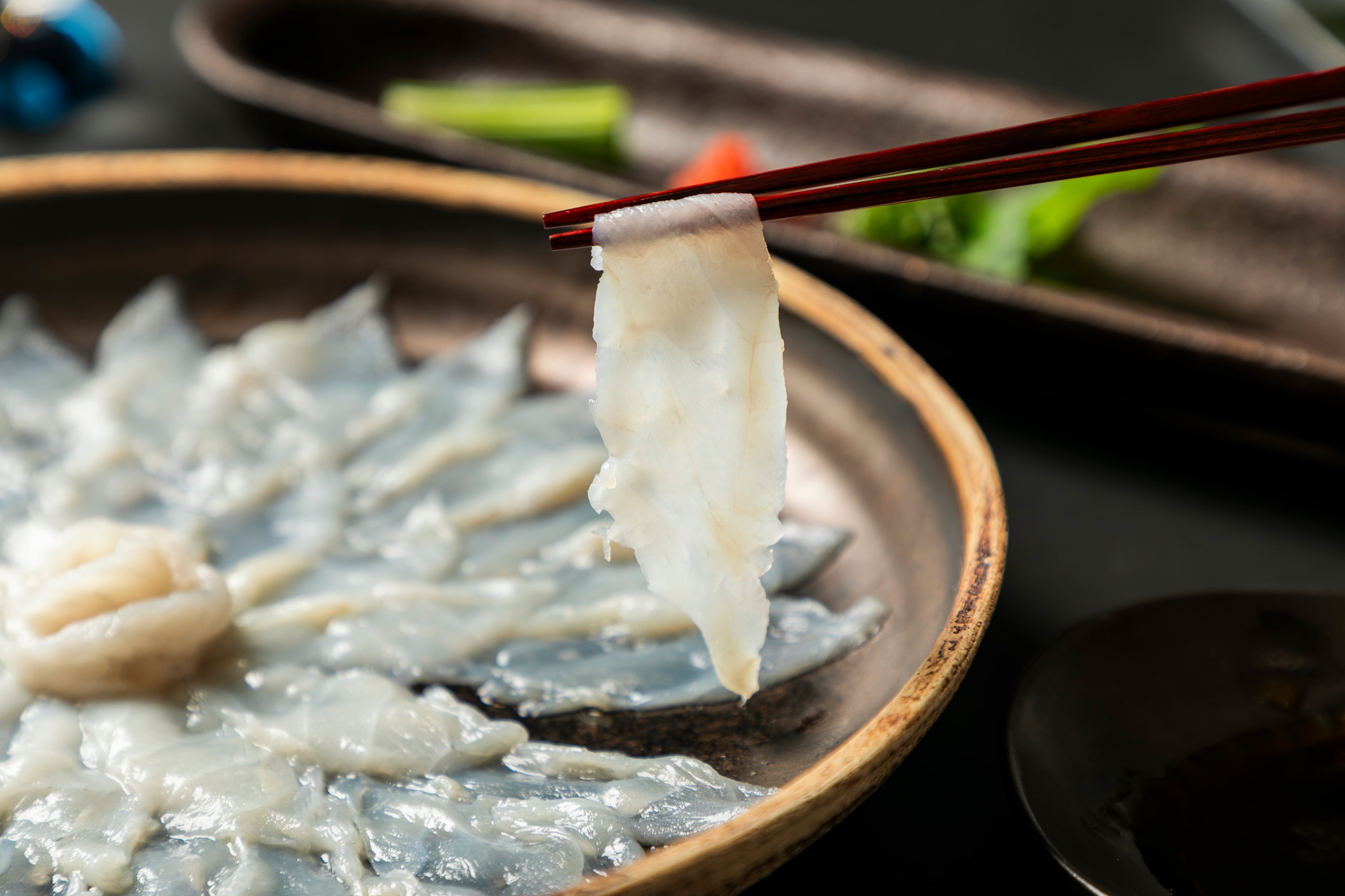 とらふぐの絶妙な甘みと旨味と歯ごたえ、絶妙な薄さに切り盛られた職人の技、透き通る身の美しさをお楽しみいただけます。